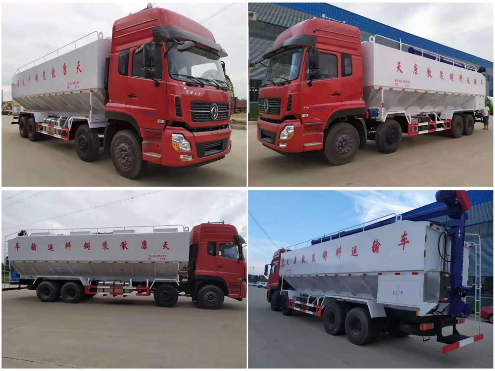 散裝飼料車,又名散裝飼料運輸車,飼料運輸車。結構簡單、性能可靠、輸送量大、操控方便、機動性強、對物料無污染等特點,廣泛應用于各大中小型養殖企業的飼料的運輸。主要用于從飼料廠向畜牧場、養禽場及飼料加工用戶運輸散裝飼料成品或飼料生產原糧,同時它也可用來運輸某些無腐蝕性粉粒狀原料,如制藥廠粉料和糧庫周轉。