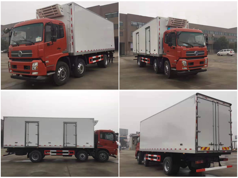 東風天錦小三軸冷藏車,整車型號:DFH5250XLCAXV,底盤型號:DFH1250AXV,準乘人數:3人,康明斯ISD245 50發動機,功率180kw,245馬力,高頂雙臥,方向助力,駕駛室空調,ABS,中控鎖,電動門窗,9檔變速箱,11.00R20鋼絲胎,軸距:1850+5450,總質量25000kg,整備質量13570kg,額定載質量11300kg,整車尺寸:11990×2550×3990(mm),廂體內尺寸:9400×2400×2450(mm),黃牌。廂體:內外玻璃鋼,8cm高密度聚氨酯保溫,底板為防滑花紋鋁板,后門鎖件為不銹鋼。制冷機組:國產-15度(冷凍)溫度可以調節。