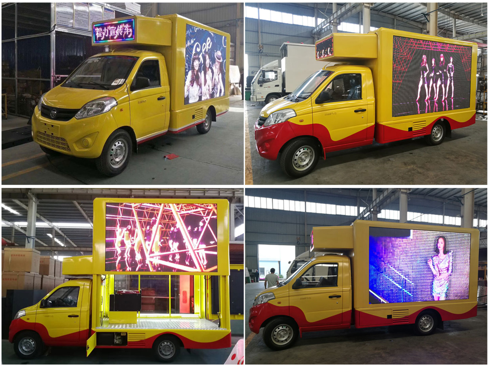 廣告車選裝配置:客戶可根據需求選裝屏幕清晰度(P10彩屏、P8彩屏、P6彩屏、P5彩屏、P4彩屏)、單面彩屏、