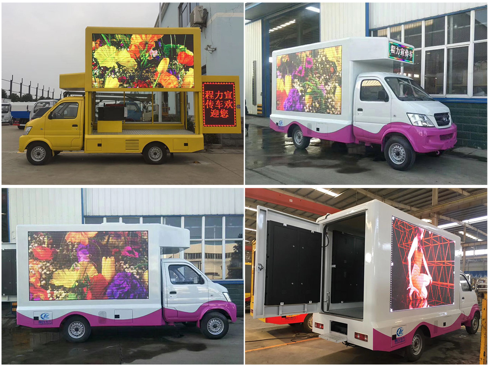 廣告車選裝配置:客戶可根據需求選裝屏幕清晰度(P10彩屏、P8彩屏、P6彩屏、P5彩屏、P4彩屏)、單面彩屏、雙面彩屏、雙面