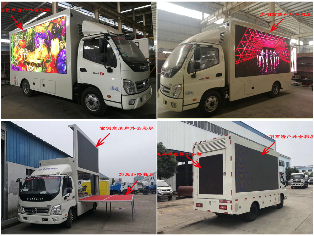 廣告車選裝配置:客戶可根據需求選裝屏幕清晰度(P10彩屏、P8彩屏、P6彩屏、P5彩屏、P4彩屏)、單面彩屏、雙面彩屏、雙面